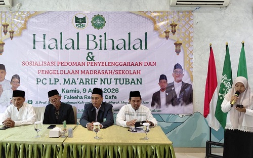 Lembaga Pendidikan (LP) Ma’arif Pengurus Cabang Nahdlatul Ulama (PCNU) Tuban menyelenggarakan kegiatan Halal Bihalal dan Sosialisasi Pedoman Pengelolaan dan Penyelenggaraan Lembaga Madrasah/Sekolah, bertempat di Faleeha Cafe & Resto Merakurak, Tuban, Kamis (09/04/2026).